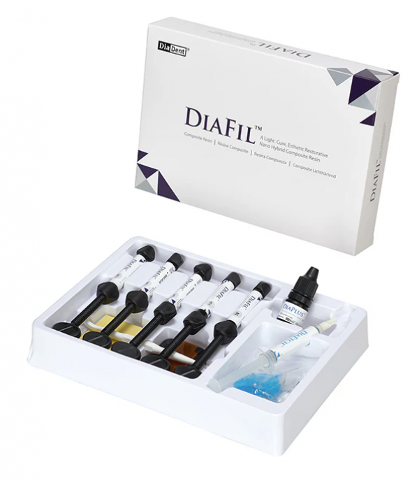 DiaFil™ is a light-cured nanohybrid composite. Utilizing the latest in nanoparticle technology, DiaFil maximizes the advantages of both the esthetic of micro-filled composite and the strength and durability of hybrid composites. It creates a beautiful and durable restoration that maintains a long-lasting gloss shine. Available in Syringe Starter Kit, syringe refills, and capsules.