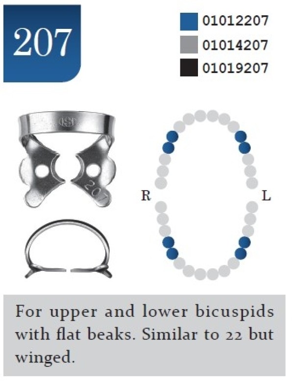 DENTECH KSK Rubber Dam Clamps Bicuspid Glossy #207, For upper and lower bicuspids with flat beaks.