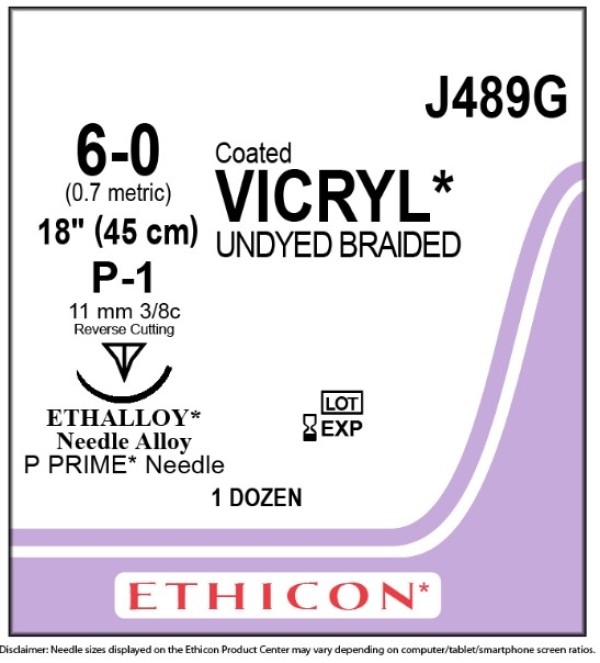 JJ489G Ethicon Vicryl 6-0 10.5mm 45cm Suture Box/12