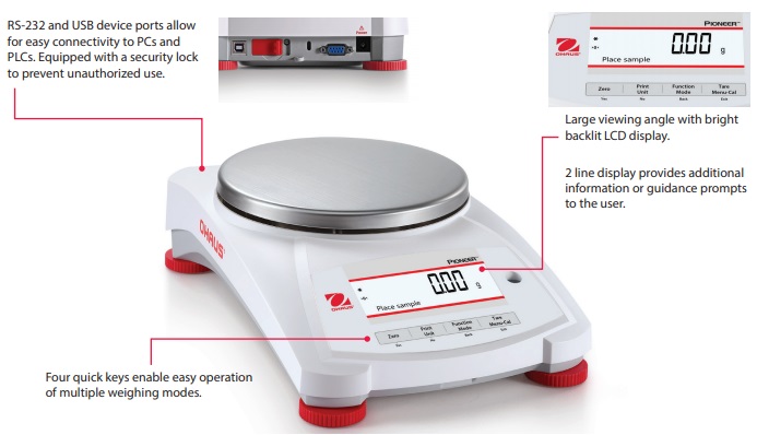 Design Features: Real Time Clock with GLP/GMP Data, integrated weigh-below-hook, security bracket, calibration lock and in-use cover, user-selectable environmental filters and brightness settings, auto-tare, auto-dim, user-selectable span calibration points, overload indicator, software lockout and reset menu, user-selectable communication settings and data print options, user-definable project and user IDs, software overload/underload indicator, stability indicator, four operating languages